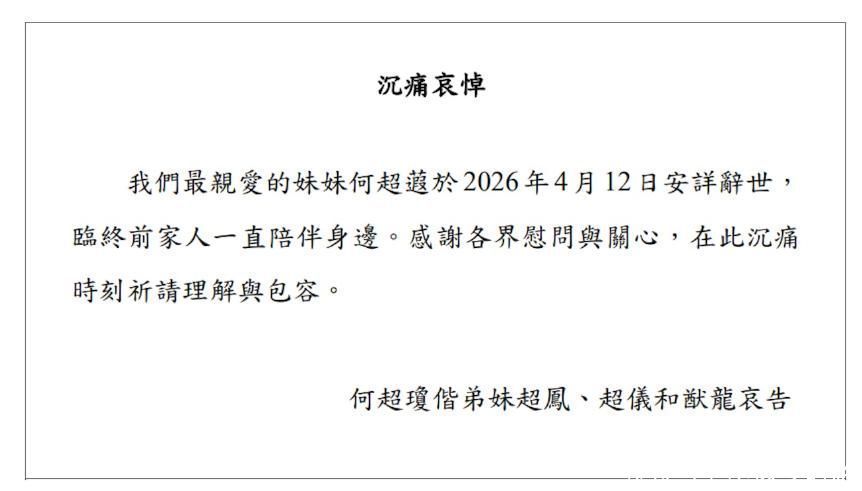 4月12日,赌王何鸿燊二房千金何超蕸因病辞世,终年六十载。