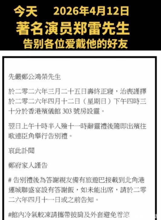同样在4月12日,资深演员吴育枢通过社交平台发布讣告,证实邵氏传奇影星郑雷先生辞世,享寿九十二春秋。